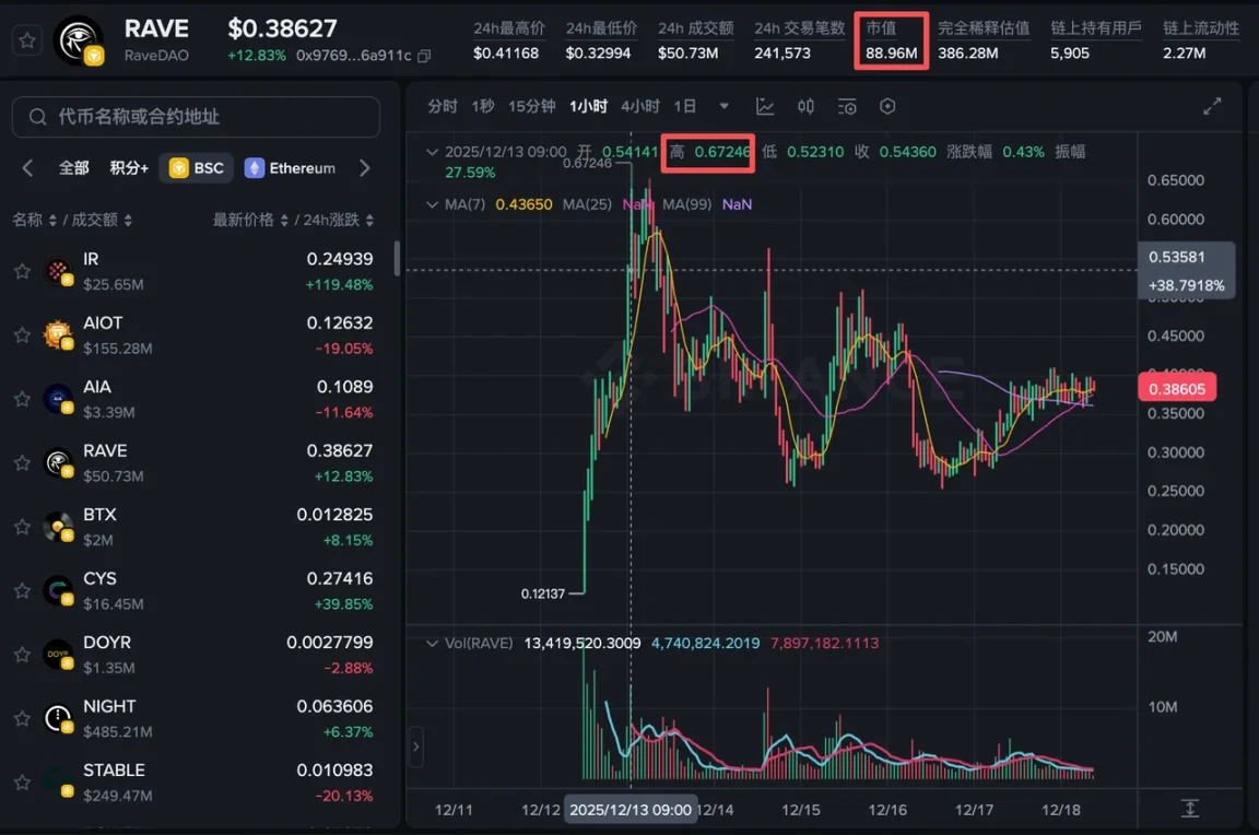 - 12 月 13 日,RAVE 价格一度触及 0.67 美元,24 小时涨幅超 410%;