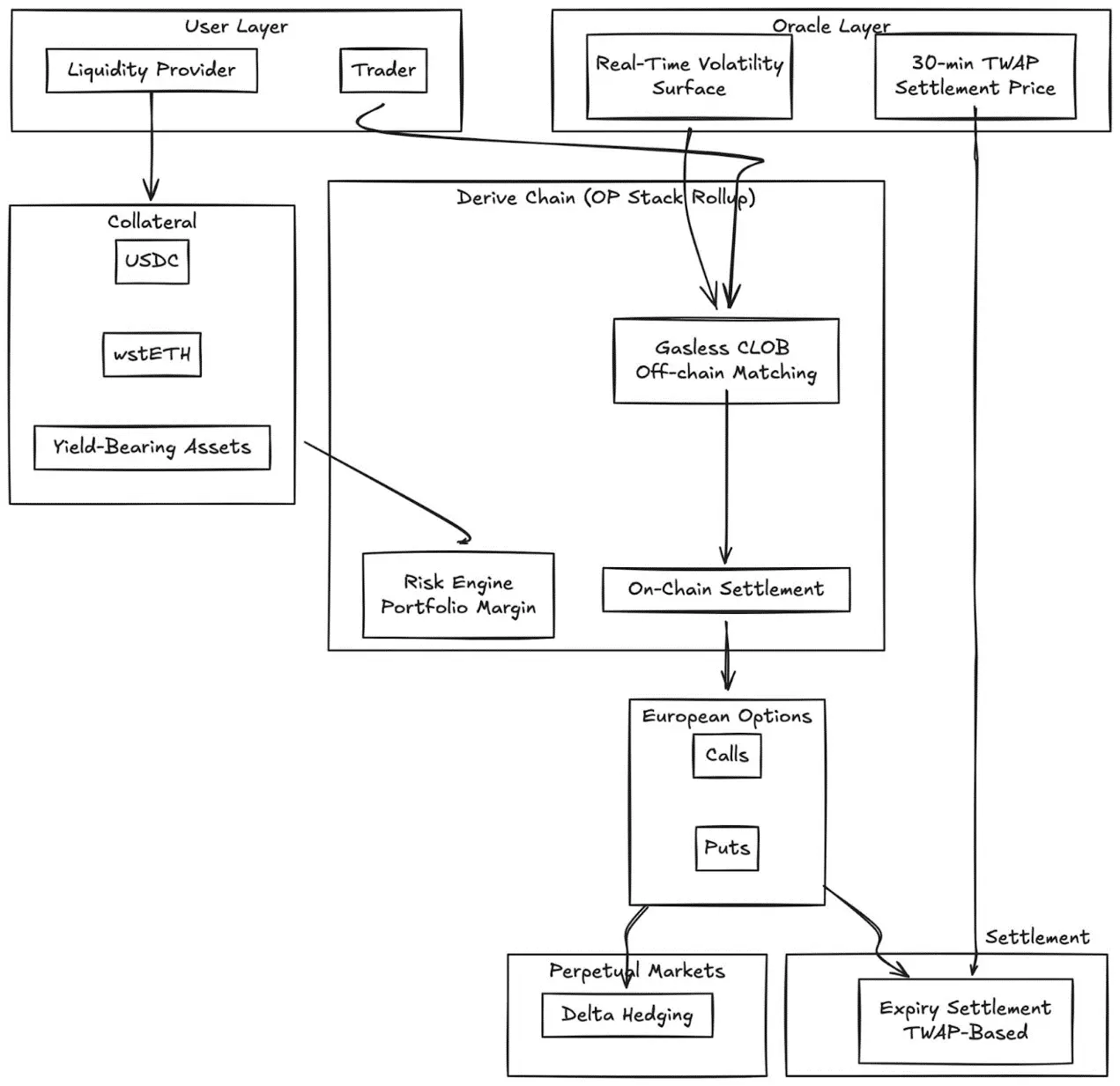 Derive(前身为 Lyra)已从其开创性的 AMM 架构过渡到无 Gas 费用的中央限价订单簿,并采用链上结算。该协议提供完全抵押的欧式期权,具有动态波动率曲面和基于 30 分钟 TWAP 的结算。