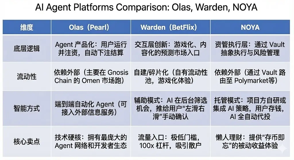 目前, 预测市场智能体(Prediction Market Agent)赛道仍处于早期 ,项目数量有限,较具代表性的包括 Olas(Pearl Prediction Agents) 、 Warden(BetFlix) 与 Noya.ai 。