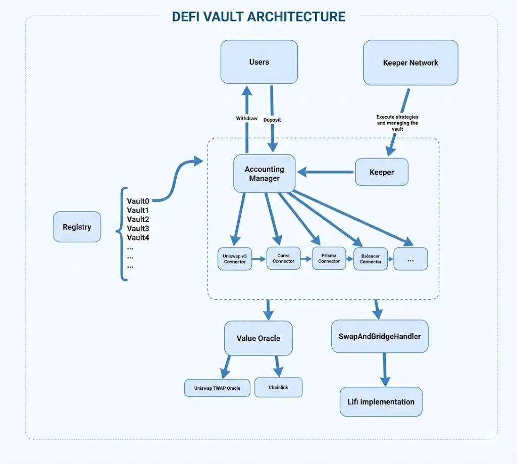 NOYA Vault(金库)的技术架构: 各金库通过 Registry 统一注册与管理, AccountingManager 负责用户份额(ERC-20)与净值定价;底层通过模块化 Connectors 对接 Aave、Uniswap 等协议并计算跨协议 TVL,依赖 Value Oracle (Chainlink + Uniswap v3 TWAP)完成价格路由与估值;交易与跨链由 Swap Handler(LiFi) 执行;最终,策略执行由 Keeper 多签 触发,形成可组合、可审计的执行闭环。