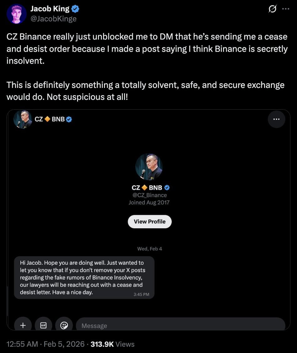 安創辦人趙長鵬 (CZ) 再度透過 X 平台對外澄清,近期在社群上流傳、指稱出自他的對話截圖與「法律信函」,都是偽造內容。他在 2 月 5 日發文指出,某些帳號張貼的所謂私訊對話是假的,並表示自己根本不認識對方,早就將該帳號封鎖,強調「從來沒有那樣私訊過任何人」。