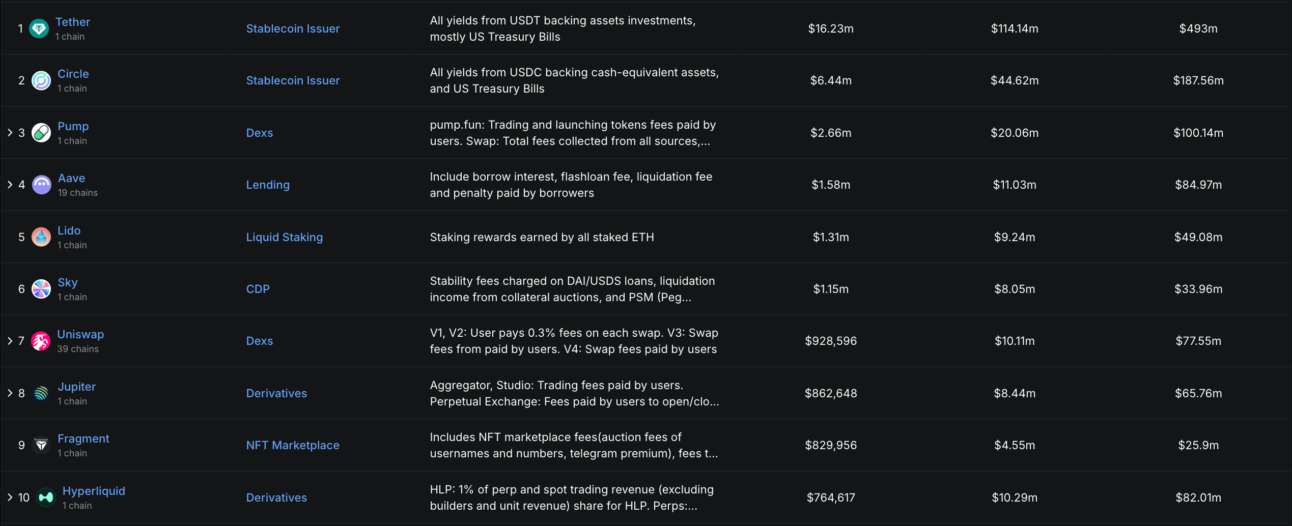 以 DeFiLlama 的统计口径为例,过去 24 小时协议收入超过 1M 美元的协议仅有 6 个,过去 30 天协议收入超过 5M 美元的也只有 49 个。这意味着仅凭协议收入,往往难以支撑过高估值,更难承接部分代币在后续解锁周期中的供给冲击。