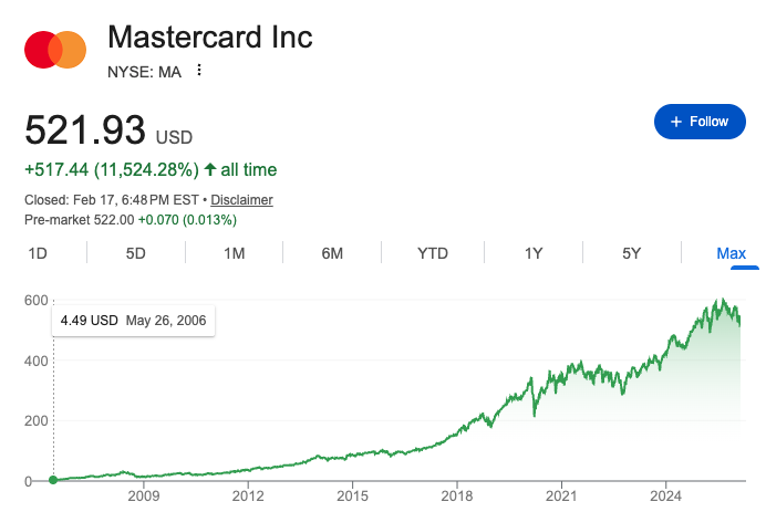 假如我们把时间线调回到 2006 年,Mastercard 在 2006 年 5 月 24 日以每股 39.00 美元完成 IPO,当时它更多被视为“银行卡网络 / 清算处理”的传统金融基础设施。