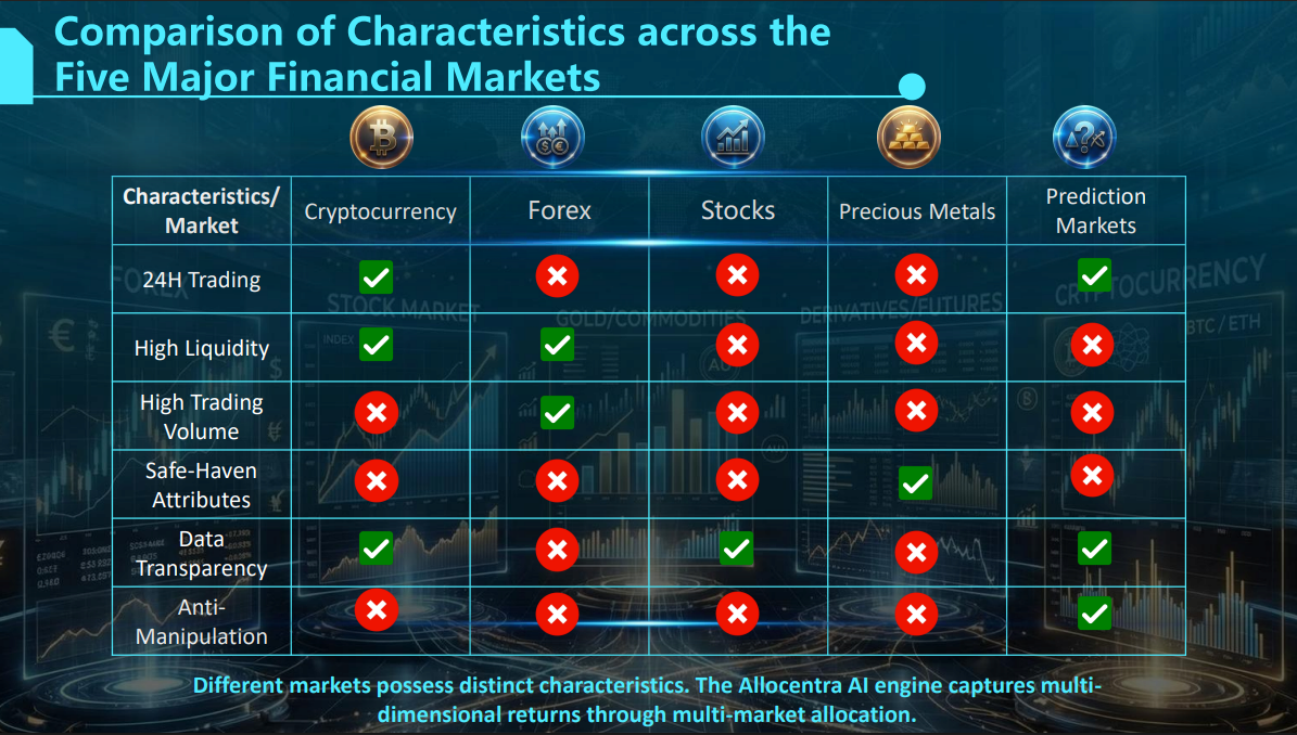 Allocentra 作为执行层,将资本意图转化为实际市场操作。通过 AI 驱动模型,系统持续分析市场动态、流动性状况与风险结构,实现跨资产类别的实时配置与动态再平衡。在此基础上,相较于依赖碎片化策略的传统资产管理方式,Allocentra 以一体化配置引擎的形式运行,具备跨全球市场进行资本协调与配置的能力。