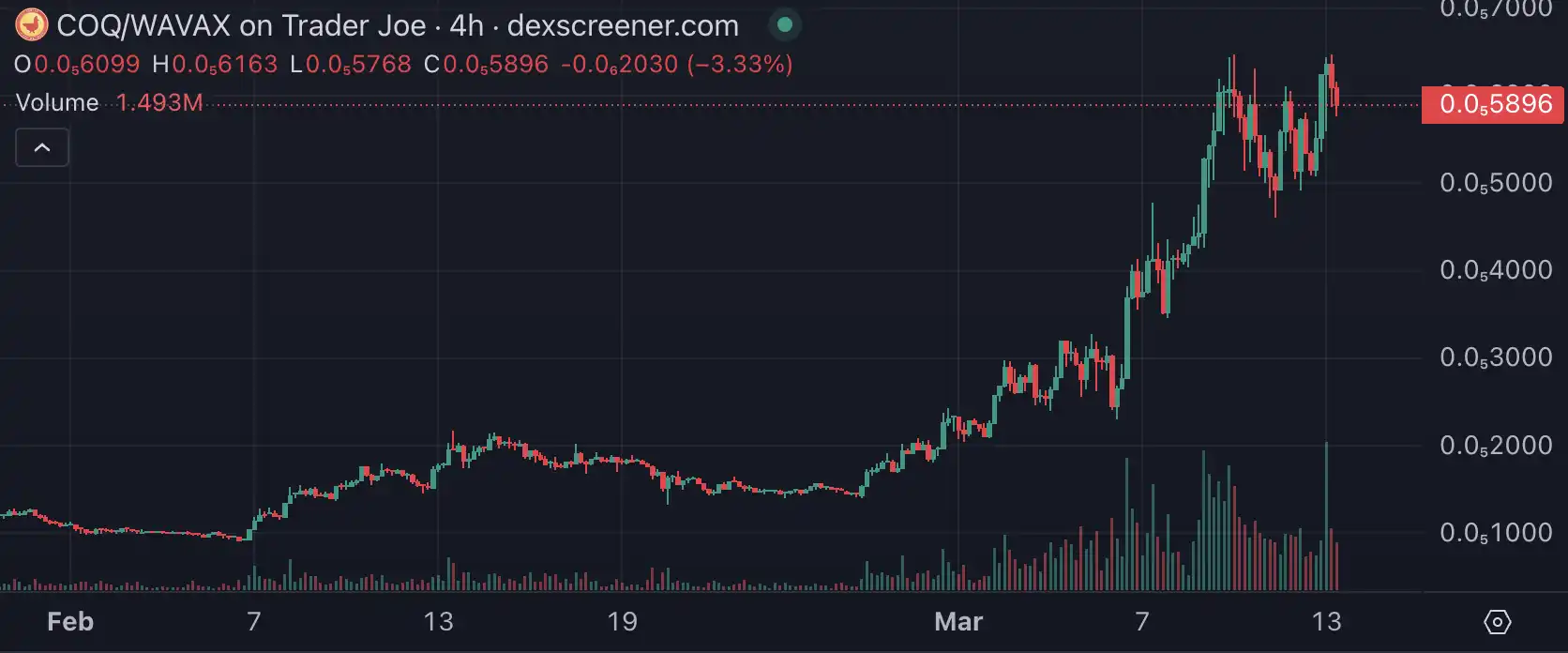 和 Near 情況一樣,Avalanche 上的 meme 幣也復活了,COQ 自底部已上漲超 300%。截至撰稿時,COQ 價格為 0.0 (5) 58 美元,24 小時漲幅達 3%。