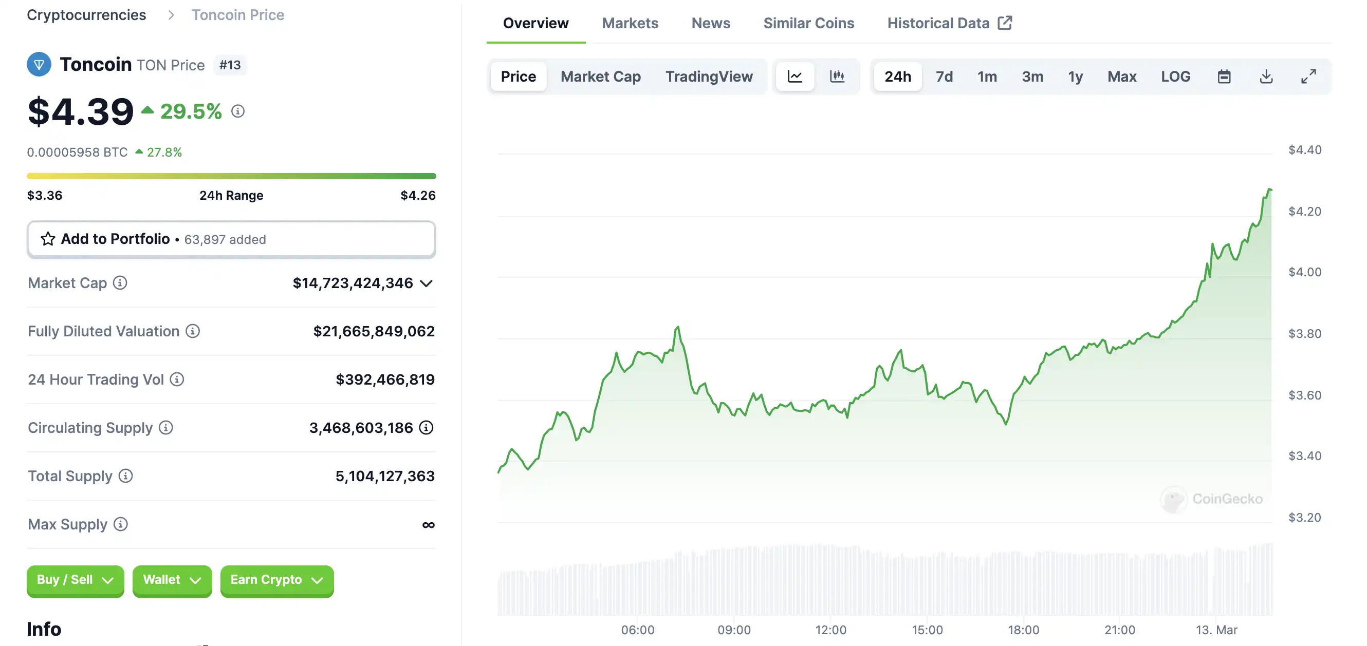 訊息公佈後,TON 短時漲超 27%,截至撰稿時,其價格為 4.39 美元,24 小時漲幅達 29.5%。