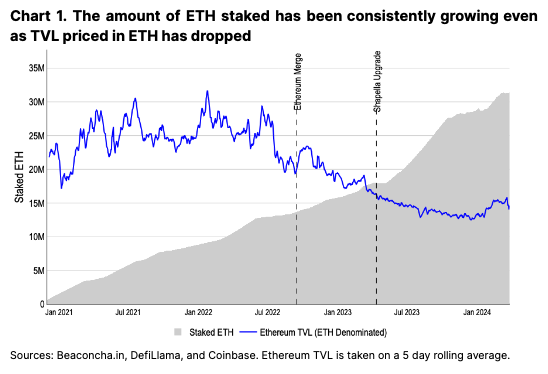 作为最大的PoS加密货币,ETH目前为保护其网络免受敌对多数攻击持有巨大的经济基础。同时,不断增长的验证者和质押ETH的数量,可以说已经超出了保护网络所必需的范围。在合并(2022年9月15日)时,有1370万ETH被质押,据推测足以保护当时的网络TVL,即2210万ETH。截至发表,大约有3130万ETH现在被质押,以 ETH 计价的数量增加了三倍,但以太坊的TVL以ETH计实际上今天(与2022年底相比)更低,为1490万ETH(见下图)。