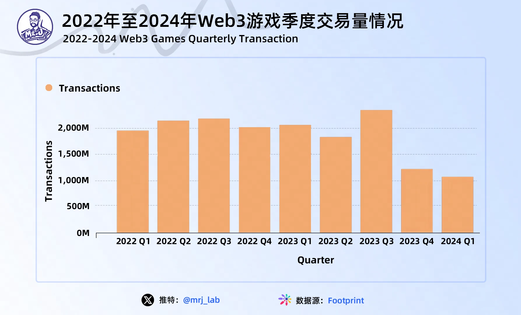 交易额能够表示资产的流动性和交易活跃度,较高的交易额表明该公链有大量的价值转移和交易活动发生。从近几年行业整体交易量来看,交易量在 2023 年第三季度达到峰值,之后回落,且低于 2022 年的平均水平。虽然Web3 游戏市场交易量较 2022 年大幅下滑,但交易次数并未大幅下滑。