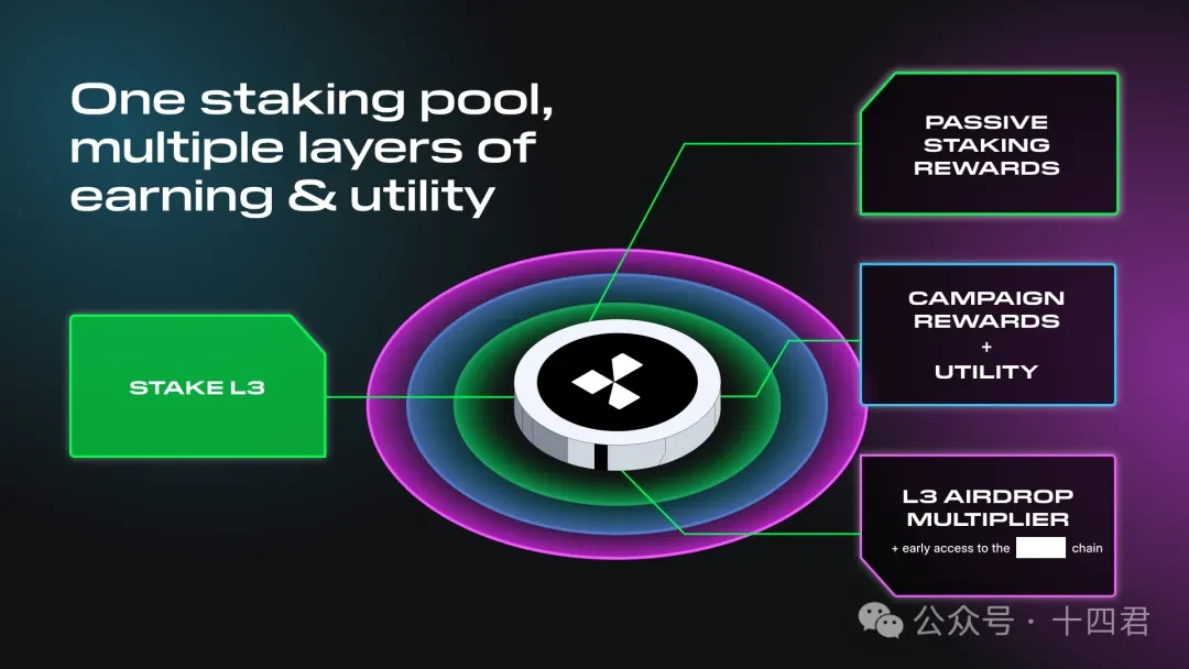 代币效用代表了代币的价值,有没有实际的使用场景,以及能不能吸引更多人的加入,即代币的需求侧。而笔者对于 Layer 3 经济模型最为关心的一点价值的积累,这一点是代币模型设计中最为反应好坏的用例,因为它直接与用户的收益挂钩。L3的效用核心理念可以归结为代币的价值与网络增长和用户的参与度保持一致。为此,Layer 3 采用了创新性的质押模型,称为分层质押。其主要的设计点如下面的两个方面: