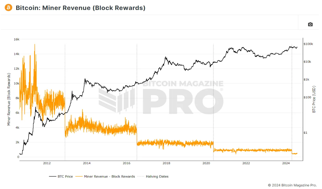 随着矿工从交易手续费中获得的收入增加,减半事件在塑造矿工激励机制中的重要性可能会降低。如果交易手续费占矿工收入的比重越来越大(如下图中黄色阴影区域所示),矿工可能会对区块奖励减少 50% 的影响不那么担忧(区块奖励收入在下图中以蓝色阴影区域表示)。这一转变表明,减半事件对矿工行为以及比特币价格的主导影响可能会随着时间的推移而减弱。