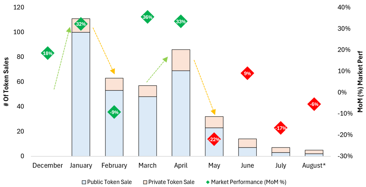 纵观过去一年,加密货币市场共上市了 375 个代币,其中通过私募的有 70 个,通过公售的有 305 个。我们通过将代币上市的数量和 Altcoin 市值的涨跌幅做成一张图表,可以看到, 代币上市的数量和 Altcoin 市值的涨幅是呈现正相关的,当 Altcoin 的市值处于上涨趋势时, 代币上市的数量会在次月急剧上升。过去几个月, 由于假期休息日多以及市场表现不佳, 导致活动减少。
