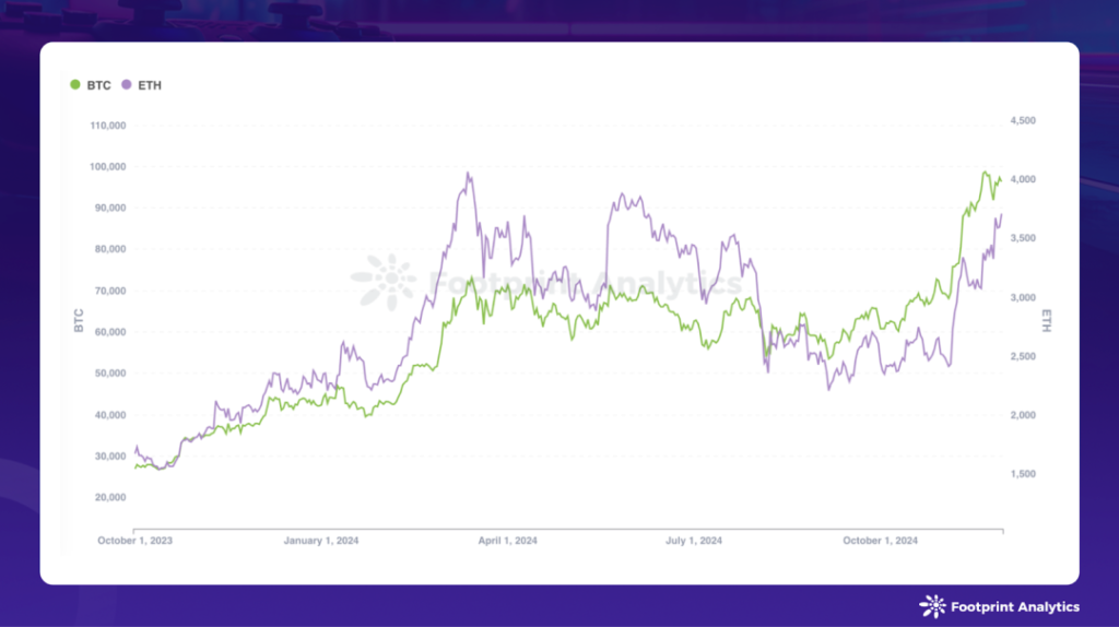11 月加密貨幣市場創造歷史,比特幣漲幅驚人,從 69,386 美元飆升至 96,427 美元,漲幅達 39.0%。以太坊緊隨其後,上漲 47.8%,從 2,511 美元攀升至 3,711 美元。比特幣的卓越表現使其市值超越白銀和沙特阿美,在 11 月 23 日接近 10 萬美元關口後,穩居全球資產第七位。