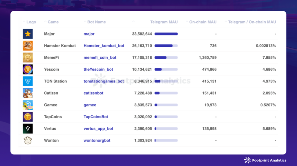 分析 Telegram 遊戲指標,我們可以看到平臺使用者與區塊鏈參與度之間的顯著差距。截至 11 月 30 日,Hamster Kombat 在 Telegram 遊戲中排名月活第二,擁有 2,616 萬 MAU,但其鏈上使用者僅有 736 個。即便是在前 10 款遊戲中實現最高轉化率的 MemeFi,其使用者鏈上參與率也僅為 7.96%,擁有 136 萬 TON 使用者。