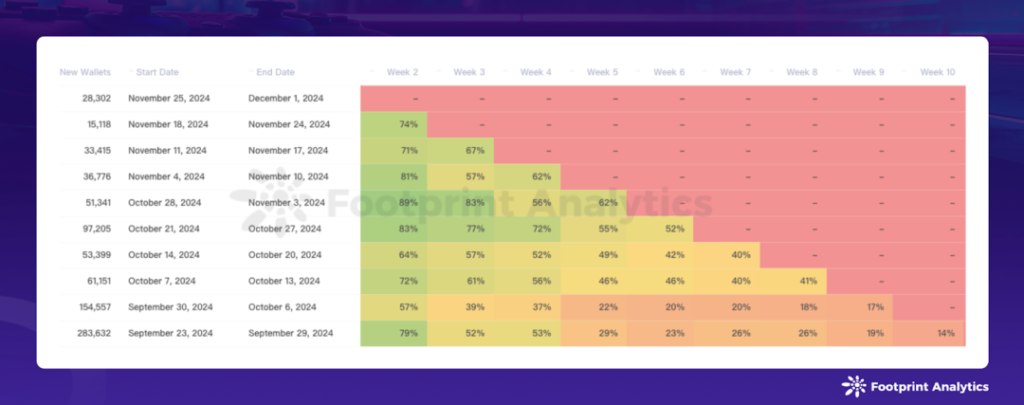 TON 遊戲生態系統面臨挑戰,DAU 下降 41.9% 至 11.64 萬,凸顯了基於 Telegram 遊戲的鏈上留存挑戰。但行業總有一些例外。Sui 的 11 月平均 DAU 為 23.33 萬,較上月增長 23.1%。Telegram 遊戲 BIRDS 貢獻了大部分使用者基礎,平均 DAU 為 22.49 萬,其每週新使用者留存率可以說是目前區塊鏈遊戲行業典範。