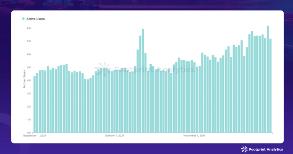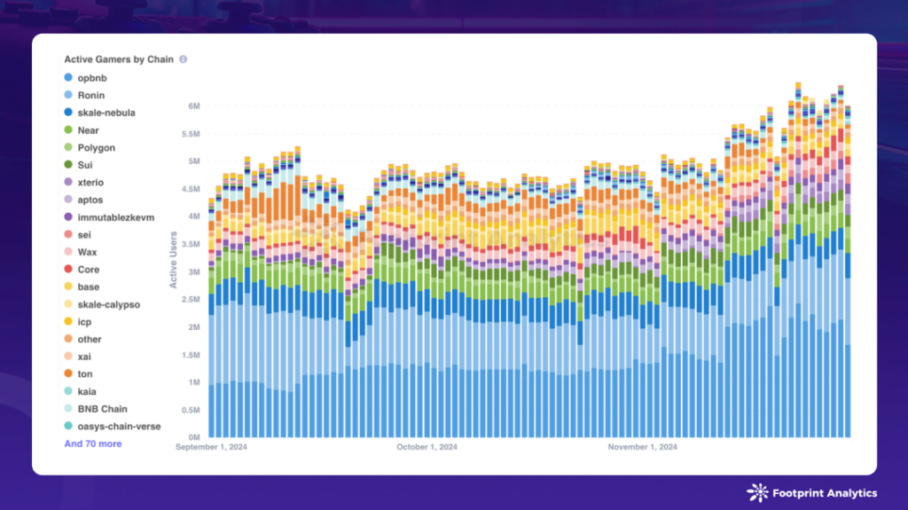 日活躍使用者在 11 月再創新高,日均 DAU 達到 550 萬,較 10 月增長 15.7%。這一增長主要得益於 opBNB 上持續的使用者活躍度和 Ronin 生態系統的穩固表現。