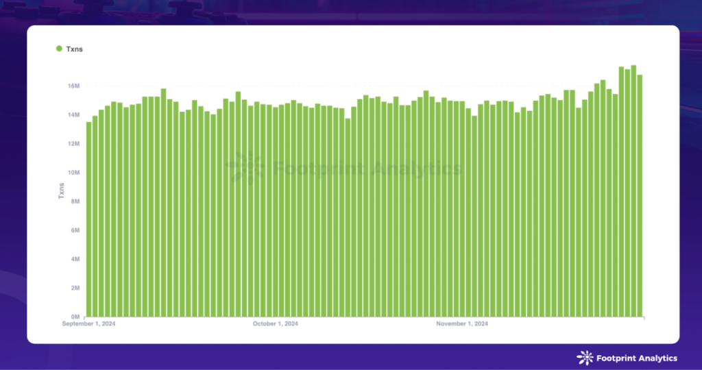 交易指標則呈現出複雜性。雖然日均交易量達到 1,530 萬筆(較 10 月增長 3.3%),但日均每使用者交易筆數從 3.131 降至 2.810。月度總交易量保持在 4.604 億筆的穩定水平,資料表明新使用者對區塊鏈功能的使用強度呈下降趨勢。