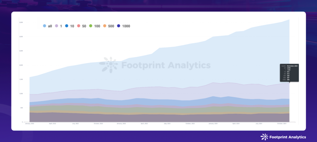 截至 11 月底,行業共有 3,602 款區塊鏈遊戲,其中 1,361 款保持活躍參與。這些遊戲中有 298 款吸引了超過 1,000 名月活躍使用者(MAU),佔活躍遊戲的 21.9%。