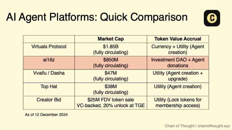 目前,Virtuals Protocol 是领先的 Web3 AI 智能体启动平台,其 Token 估值为 18 亿美元,使其成为市场领导者。相比之下,ai16z 位居第二。许多人认为,如果 ELIZA 继续推动更有用和创新的 AI 智能体的创建,ai16z 有潜力赶上甚至超越 Virtuals,即使只是单纯依靠市场认知和投资者 / 零售兴趣。