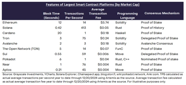 智能合约平台领域可能是数字资产行业中竞争最激烈的细分市场。虽然 2024 年对于该领域的领导者以太坊来说是具有里程碑意义的一年——以太坊获得了美国现货交易所交易产品(ETP)的批准,并进行了 重大升级 ——但 ETH 的表现不及某些竞争对手,如 Solana,后者是该领域中市值第二大的资产。投资者还将注意力转向了其他L1网络,包括 Sui 等高性能区块链以及与 Telegram 平台集成的区块链 TON。