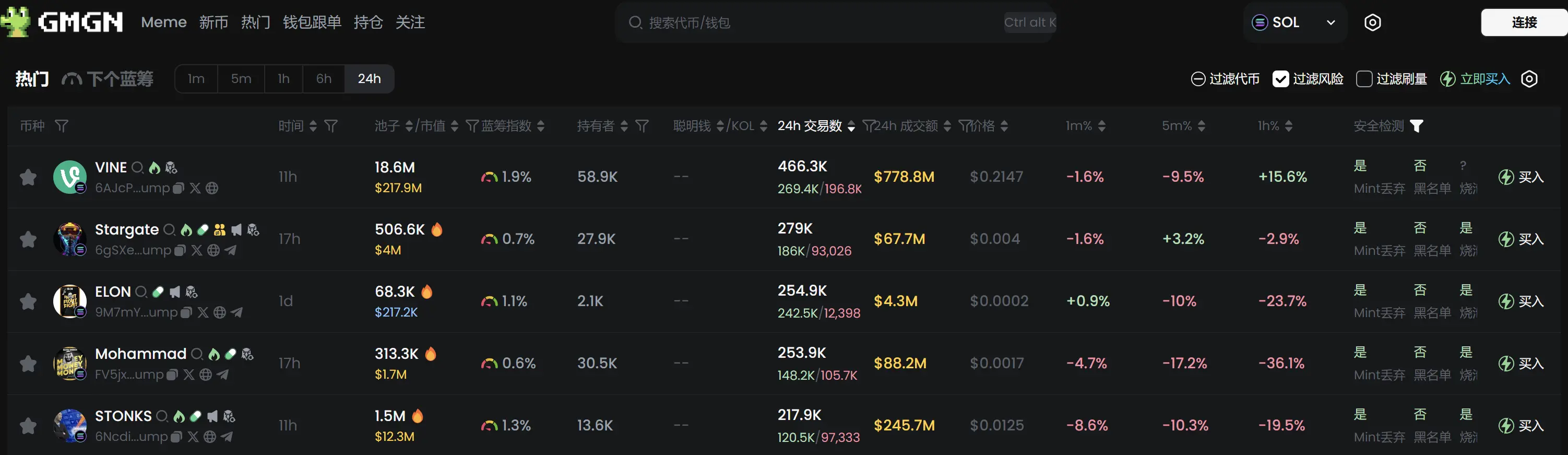 过去 24h Solana 热门代币前五依次为:VINE 、Stargate 、ELON、Mohammad 、STONKS