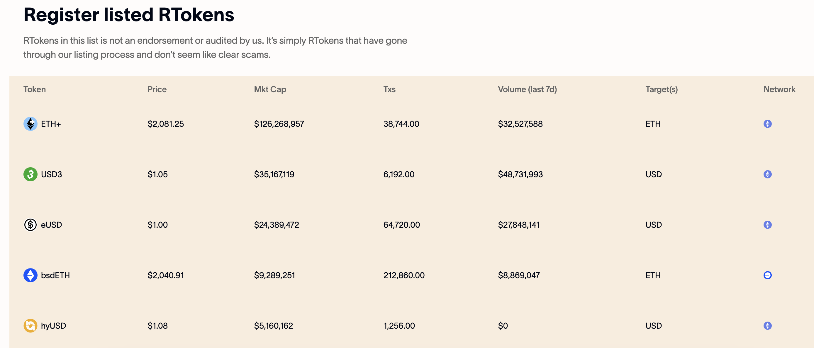 Reserve 最初推出的美元穩定幣為 RSV,但後來被更靈活的 RToken 框架取代。首個代表性 RToken 為 MobileCoin 發行的 eUSD,其抵押資產包括部署於 Compound 的 USDC 和 USDT,以及 Aave 的 USDC,具備低手續費與隱私交易特性。此外,也出現如 ETH+、bsdETH 等錨定以太幣的 RToken,進一步拓展應用場景。