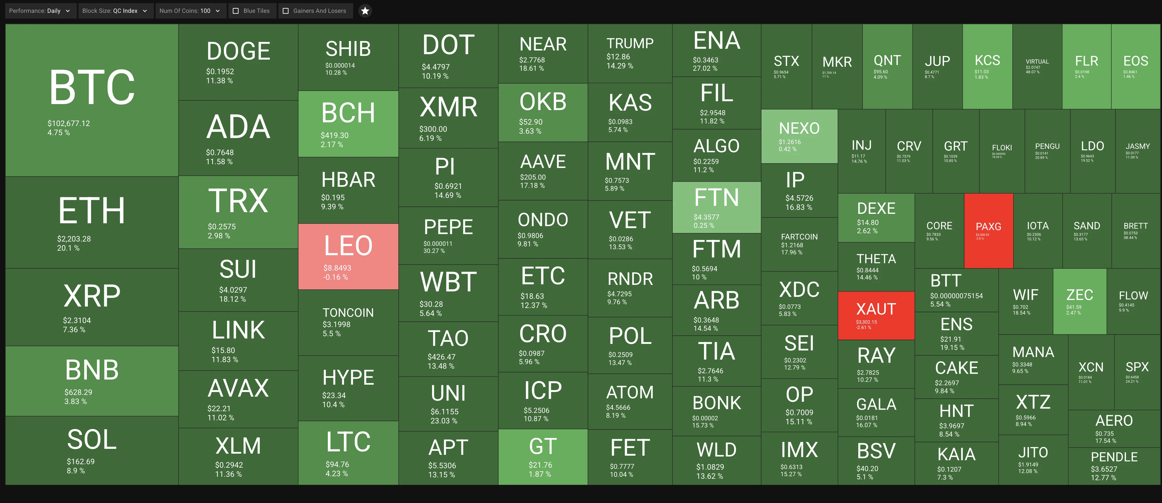 昨日晚间,比特币再次突破 10 万大关,最高至 104000 美元, 24 小时涨幅 7.41% ,创近三月以来新高。 其他主流山寨币也出现大幅上涨,根据 Quantify Crypto 数据,大部分市值前 100 币种均处于上涨,主流山寨涨幅较大,ETH 突破 2200 美元, 24 小时涨幅 20.1% ;SOL 突破 160 美元, 24 小时涨幅 8.9% ;DOGE 突破 0.19 美元, 24 小时涨幅 11.38% 。