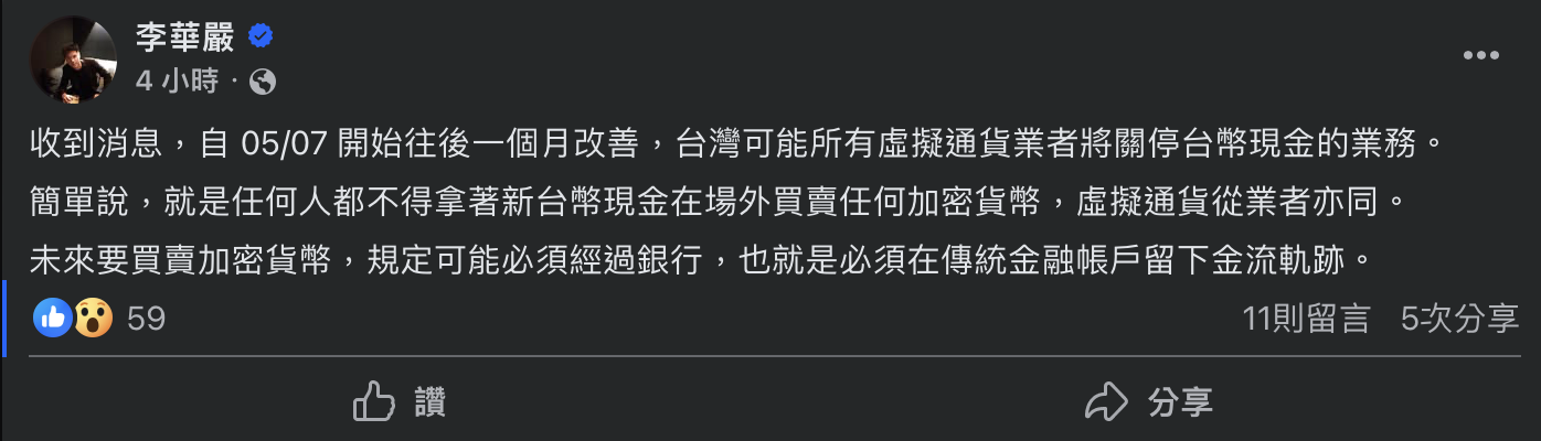 今 日(12)上午社群 傳出消息 : 「(金管會)自 05/07 開始往後一個月改善,台灣可能所有虛擬通貨業者將關停台幣現金的業務。簡單說,就是任何人都不得拿著新台幣現金在場外買賣任何加密貨幣,虛擬通貨從業者亦同。」