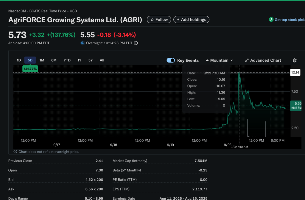 納 斯達克上市的農業科技公司 AgriFORCE (AGRI) 本週以一句宣告改寫定位:公司決定更名為 AVAX One,並計畫建立高達 7 億美元的 Avalanche (AVAX) 加密資產金庫。消息發布後,股價在週一開盤由 2.41 美元急衝至 7.30 美元,盤中漲幅一度超過 300%的 10.14美元,最終收在 5.53 美元,單日仍上揚 137%。短短數小時內,傳統股市和區塊鏈資本同時被這場突如其來的轉型震動。