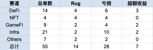 Rug占比14/55(25.45%):重灾区是NFT项目,全线归零,一个背靠大IP的“明星项目”,早期NFT火爆,但团队Web3经验浅薄,创始人是顶流明星对发币兴趣缺缺,核心成员出走后soft rug;另一个“音乐+Web3”项目,从巨头出走做了几年项目,啥都没落地,悄无声息凉凉。还有Dex项目的“高管创业梦”:创始人让团队打黑工自己收钱,核心员工跑路;某高校实验室出的“潜力股”,基本都挂了。