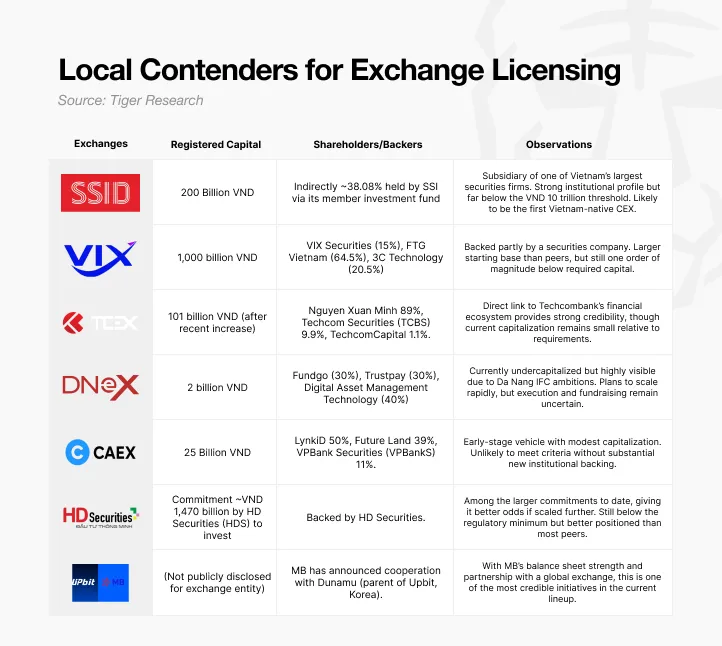其次,机构锚定将决定谁能存活。决议要求至少 65%的机构所有权,包括至少两家银行、证券公司、保险公司或技术企业的 35%份额。这一条款明显有利于已经与 SSI、VIX、Techcom、HD 和 MB 等主要金融机构有联系的参与者,而让 DNEX 或 CAEX 等金融科技主导的载体处于劣势,除非他们能够吸引更强大的合作伙伴。