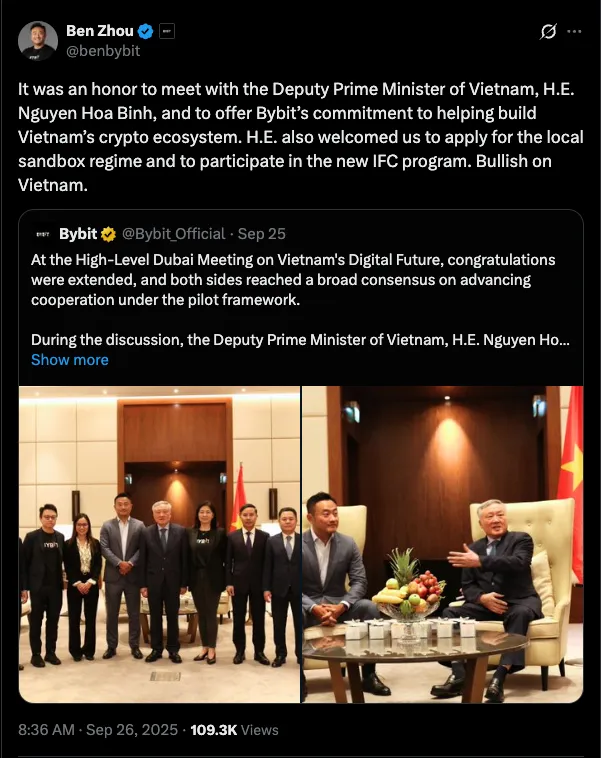 Bybit 同样攻势凌厉。2025 年 9 月 17 日,它与岘港人民委员会、阿布扎比区块链中心及 Verichains 共同签署三方备忘录,合作涵盖流动性供给、基础设施安全及生态联通,精准契合越南监管目标。虽未达币安的高层会晤级别,但为其参与国际金融中心建设奠定实操基础。