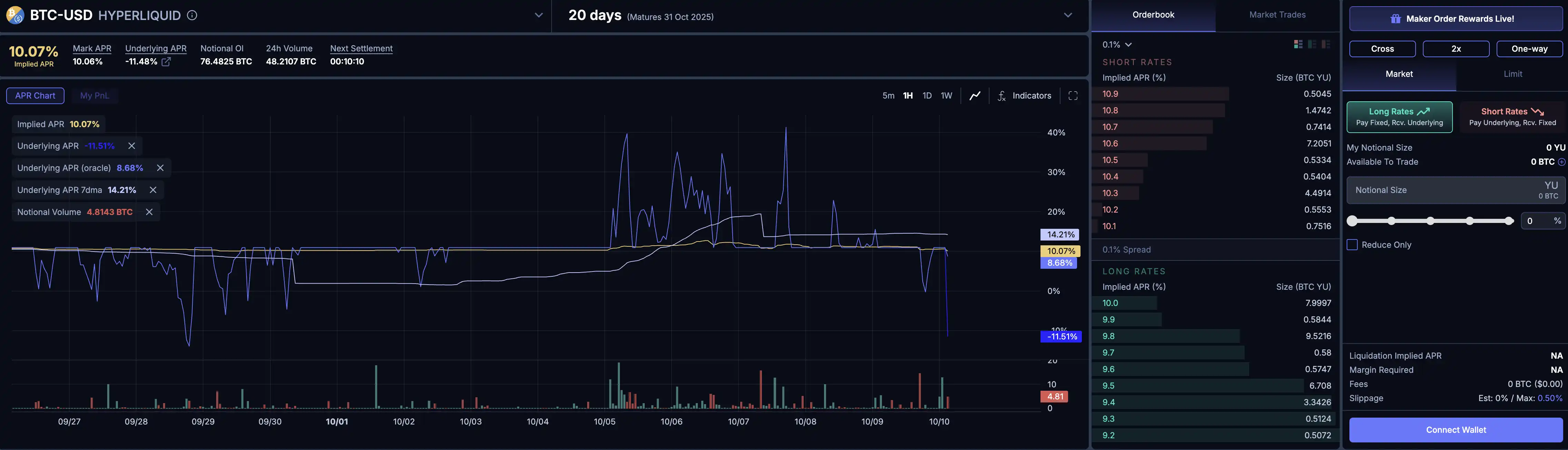 至于 Boros 的利率交易,走的是订单簿 + 保证金的形态,体验更像期货交易平台,可以做多或做空资金费率。当前 Boros 已在 Arbitrum 主网上线,首批支持 BTC/ETH 永续合约市场的资金费率交易(已接入 Binance 和 Hyperliquid 的 BTC/ETH 市场),用户在 Boros 上挂单撮合交易 YU,就能获得对应资产未来资金费率的多头或空头敞口。