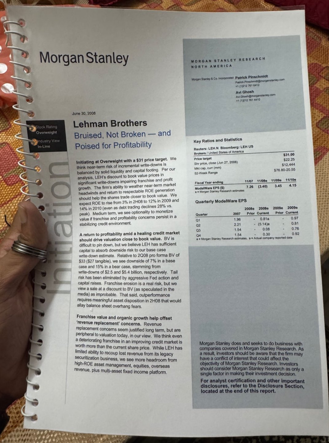 摩根士丹利(Morgan Stanley)在雷曼兄弟(Lehman Brothers)申請破產前僅僅三個月,發布的研究報告標題為《雷曼兄弟:受挫但未倒下,準備恢復獲利!》近來 X 平台上不少人在討論回味這件金融慘事,更有報告的照片曝光。