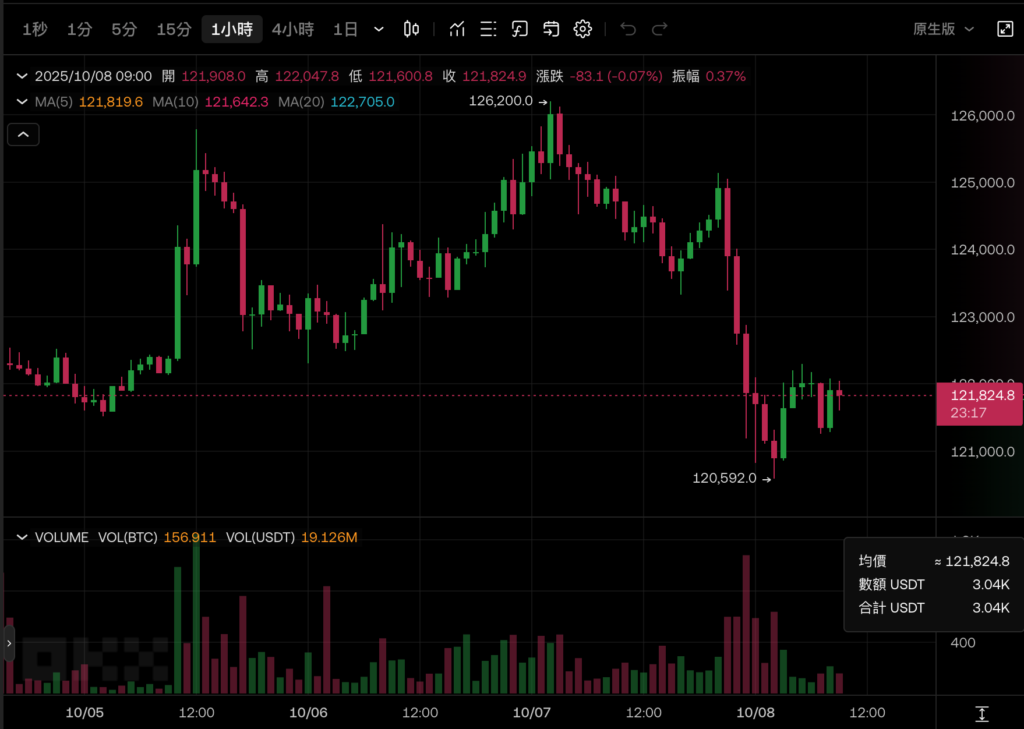 比 特幣昨(7)晚九點後出現大量賣壓!OKX 市場數據顯示,BTC 在今(8)日 02:15 左右最低下殺 120,592 美元,前三天漲幅全部回吐。