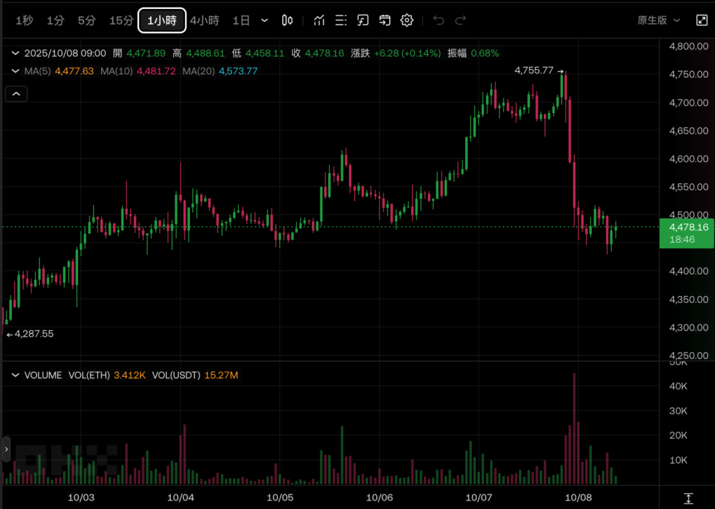 以太坊同樣受到衝擊,今晨最低下殺 4,428 美元,截稿前暫報 4,478 美元,近 24 小時下跌 4.18%。