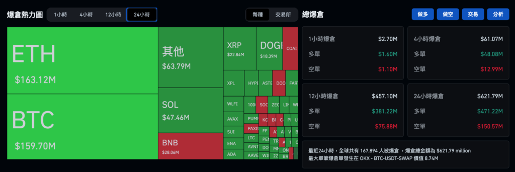 短時間的劇烈波動也帶來的巨額清算,據 Coinglass 數據顯示,在過去 24 小時內全網爆倉金額就達到 6.2 億美元,全網有超 16.7 萬人遭清算。