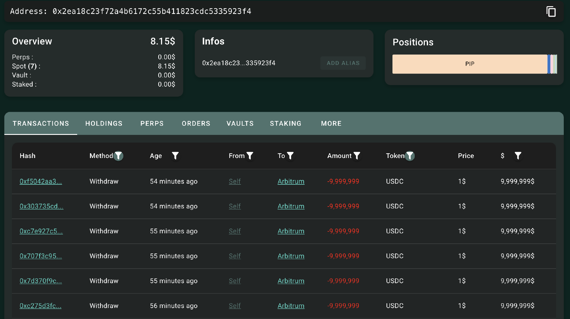 簡單舉個例子,Hypurrsan 資料顯示,0x2ea18 開頭的巨鯨地址過去 24 小時透過做空 BTC 和 ETH 盈利 7233 萬美元,該巨鯨已將 6000 萬美元 USDC 提回 Arbitrum,落袋為安。