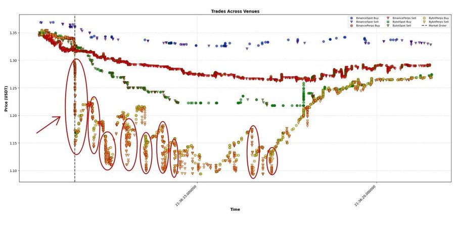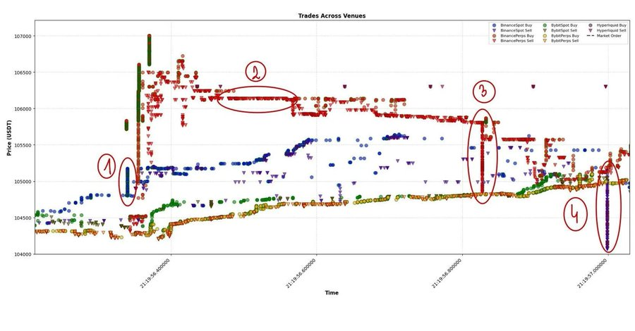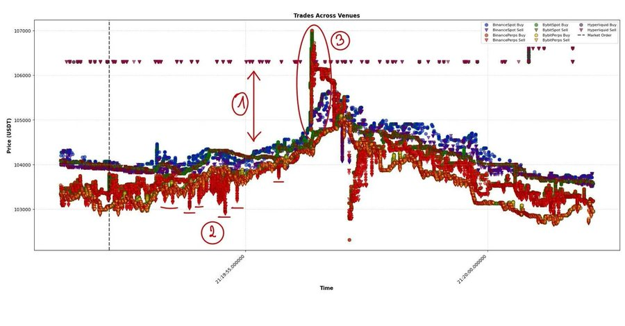 最后,(3)与(4)这两种情况可能相互关联。 在币安永续上出现了一笔大额市价卖单,随后几乎以相同规模传播至 HyperLiquid,再次实现跨平台的价格平衡。