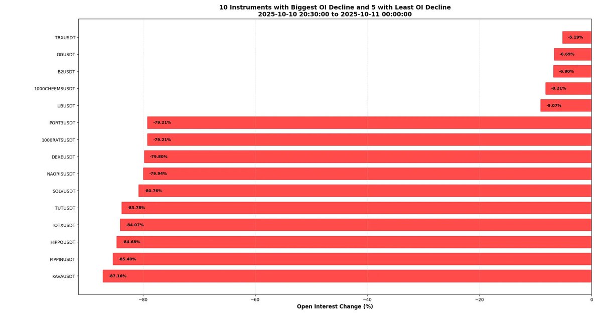 一些品种的未平仓量甚至减少了 80%。也就是说, 不到五分之一的合约“幸存” ——这个数字在任何标准下都极端得惊人。下表列出了极端案例:KAVA 以近 90%未平持仓量坍塌“荣登”耻辱榜,而 TRX 几乎没动,仅下降约 5%。这清楚反映了部分市场的高杠杆状态,以及去杠杆过程的残酷性。