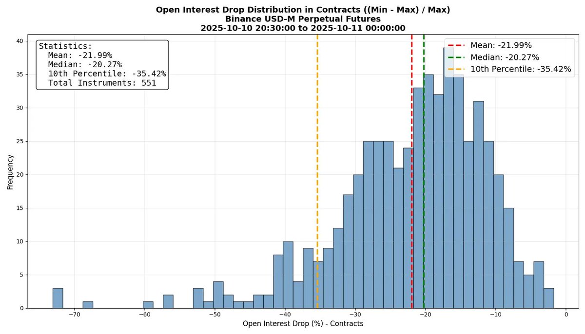这次下跌几乎彻底摧毁了市场结构。从下图可以看到,Binance 永续合约的 未平仓量平均下降接近 50% 。超过 50 个交易品种的未平仓量跌幅超过 64% 。这意味着:在崩盘期间,超过一半的合约被关闭——无论是通过强平、ADL 还是手动平仓。未平仓量可以近似理解为市场规模,因此我们可以说: 市场在那一天平均缩水约 50%。