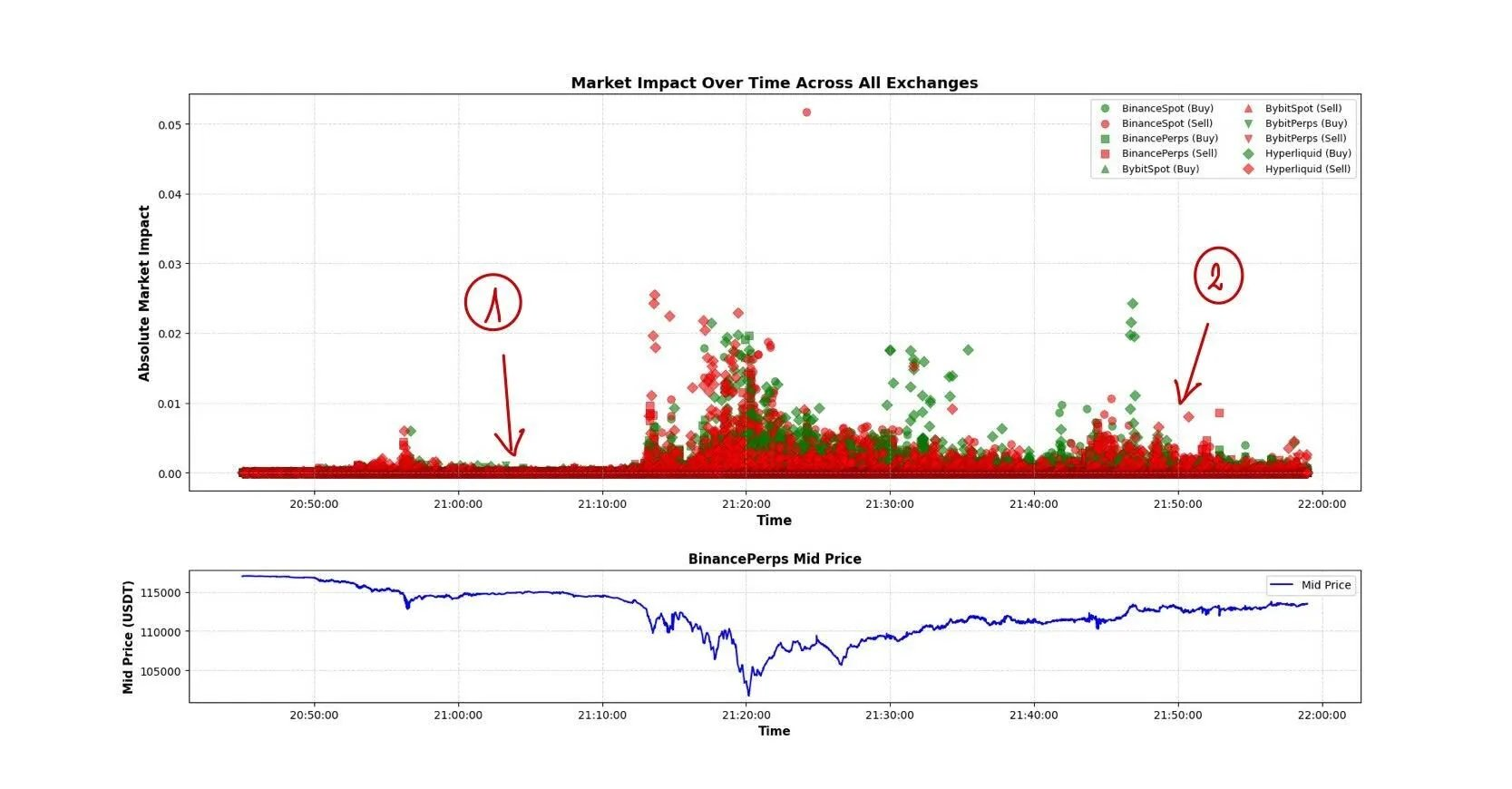 我们该如何“解码”这样的事件?首先,(1)是 市场间传播的信号 。此次发起大额市价单的是 Binance 现货市场。根据分析,在波动性较低的时期,Binance(现货)并非主要的价格驱动者,但在此次事件中,它更频繁地成为了市场波动的起点。随后,其他交易所以毫秒级延迟陆续跟进。这里的关键在于:不同交易场所的市场冲击强度差异——Binance(现货)、Binance(永续合约)及其他平台。可以看到, 在 Binance 出现该笔大额市价单后,其他交易所的跟进强度明显较弱。 因此,在此类交易后建模市场新的均衡状态,对于理解市场动态与跨平台传播机制至关重要。