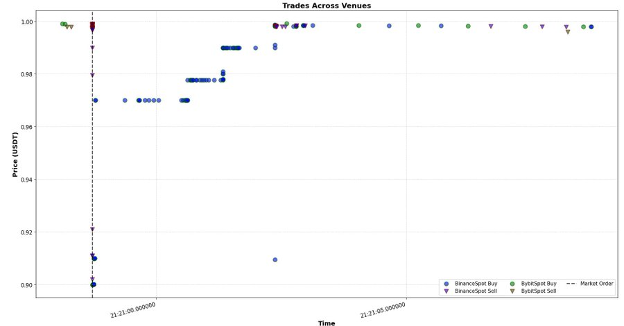 下图可以作为证据:有一笔相当大的市价单,瞬时市场冲击约为 10%,但价格很快恢复到 1 美元附近——发生在晚上 9:21 左右,正好是市场触底之后。