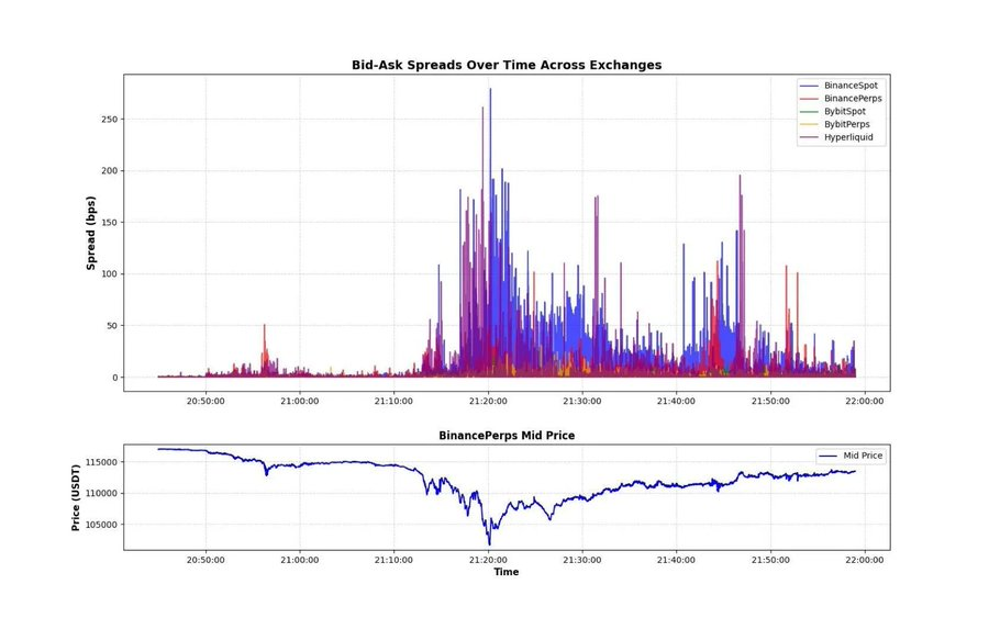 - Hyperliquid 与其他市场之间存在显著价差 —— 这很可能源于 USDT 与 USDC 定价的短期差异(图中其他交易所均以 USDT 报价)。在极端波动时期,这类稳定币价格波动必须被纳入公允价值模型中。