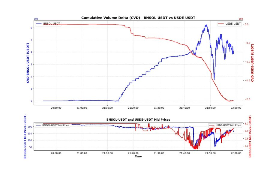 一个更让人意外的发现:看看 USDE 与 BNSOL 的 CVD(累计成交量差)。 USDE 的 CVD 并不异常——约 2 亿美元的卖压虽然不小,但大部分出现在下跌之后(很可能是由激进套利者撮合的可成交限价单)。