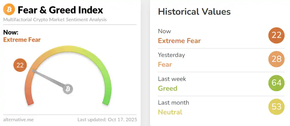 Coinglass 数据显示,过去 24 小时,全网未平仓合约爆仓 11.89 亿美元,多单爆仓 9.35 亿美元。最大单笔爆仓单发生在 Hyperliquid - ETH-USD 价值 2042.74 万美元。alternative 数据显示,目前市场恐慌指数已低至 22,陷入极度恐慌。