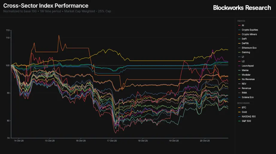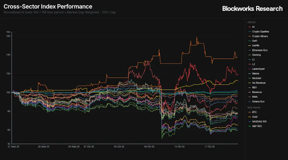 虽然短期显示一些上涨,但月线图显示几乎所有的加密货币指数在过去 30 天内都在下跌。10 月 10 日的清算事件导致了普遍的疲软,只有黄金、加密货币矿工、AI 和股票指数是表现强劲的领域。