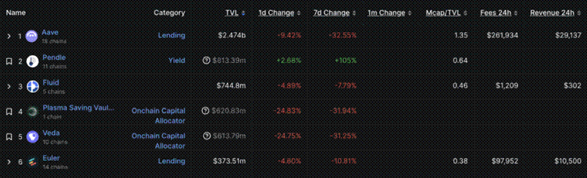 自 2025 年 9 月 25 日 Plasma 主网 Beta 版本上线以来,其生态发展迅速,不到一周时间,TVL 已突破 50 亿美元。其中,超过 45 亿美元的资金来自 Aave,主要资产依旧是 USDT。此外,Fluid、Euler、Balancer 等 DeFi 协议也为生态贡献了可观的流动性。