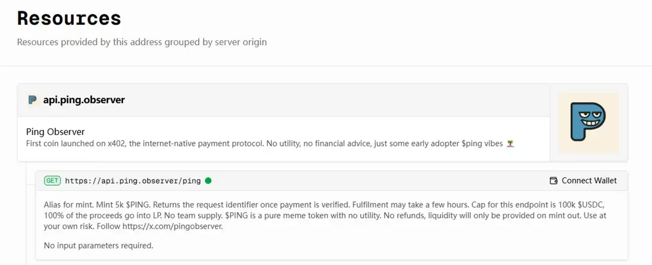 而工作流程也解释了为什么 $PING 的铸造过程会像铭文,因为它需要经过 x402 验证器的确认。在铸造过程中,大量的铸造请求不仅把铸造接口一次又一次地干爆,也是第一次给 x402 协议来了场实打实的压力测试。