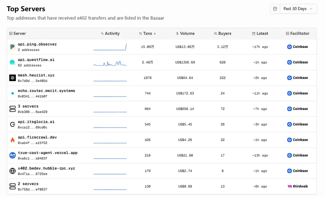 过去 30 天的数据显示,$PING 的接口收到了超过 15 万笔 x402 交易,金额达到约 14 万美元,断崖式领先排名第二的 Questflow