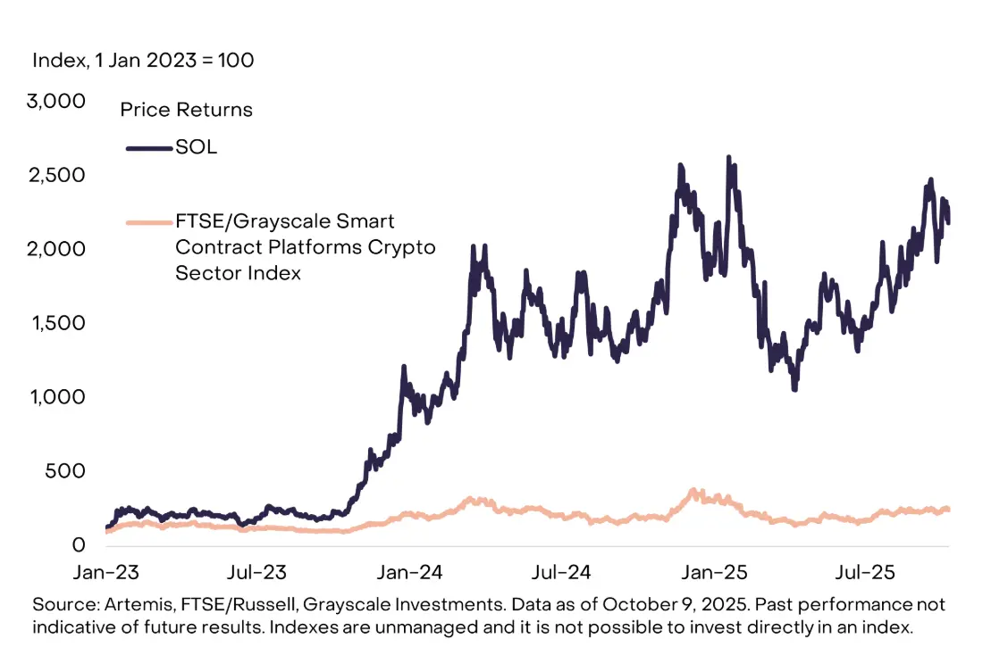 但從 2023 年底開始,SOL 代幣開始復甦,表現顯著優於富時/灰度智慧合約平台加密貨幣產業指數。